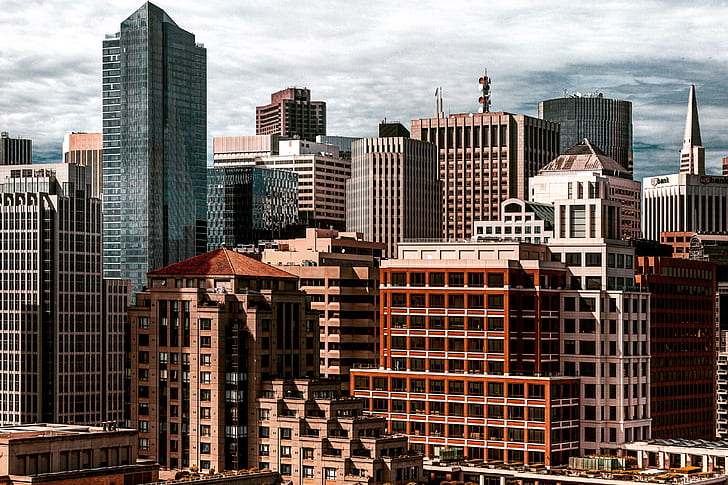 man wearing quilted gray jacket sitting on building top across body of water with docked cruise ship beside buildings under blue sky -