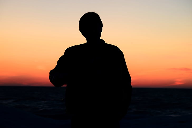 photo of gray angel statue, silhouette of man and woman in black dress -