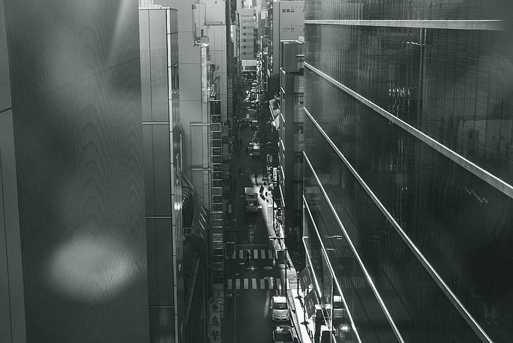 grayscale photography of woman carrying paper bag while crossing the pedestrian lane -