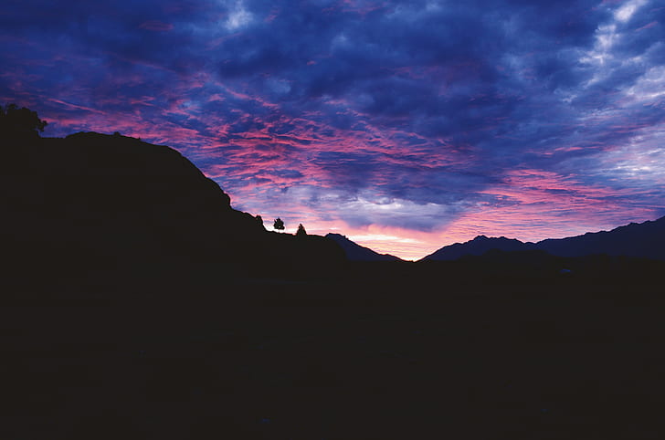 silhouette of mountain under purple clouds -