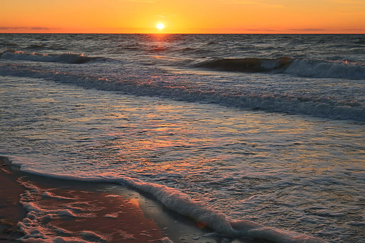 four empty wine glasses on white tablecloth near body of water at golden hour